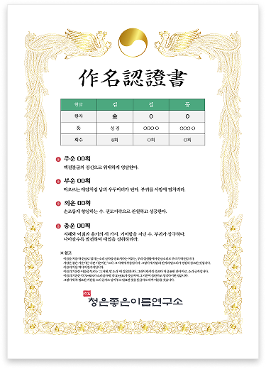 신생아 작명 포함, 개명, 아호, 예명, 상호, 법인명 등 모든 작명 서비스에 대한 공식 작명인증서를 발급하여 발송해 드립니다.