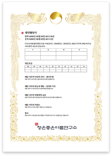 아이가 인생을 살아갈 운의 흐름, 사주팔자의 기틀을 닦는 중요한 과정입니다. 출산 기간 내에서 아기에게 가장 길하고 조화로운 오행의 흐름을 지닌 사주를 찾아드립니다.
